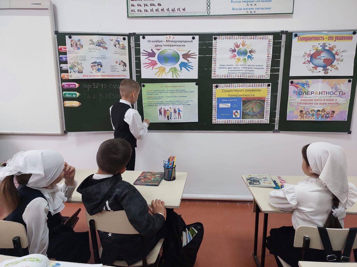 18.11.2022Классный час ко Дню толерантности на тему: «Мы разные, мы вместе» был проведен 16 ноября Серсаевой Л.Х.Цель: формировать первичные представления о толерантности как качестве личности.Задачи:- познакомить с понятием «толерантность», признаками толерантной личности;- мотивировать к развитию позитивных качеств личности (доброжелательности, толерантности, умению сотрудничать), анализу собственных поступков, коррекции собственного поведения;- развивать творческие способности обучающихся;- способствовать формированию позитивной позиции по отношению к окружающему миру, к людям, к себе.