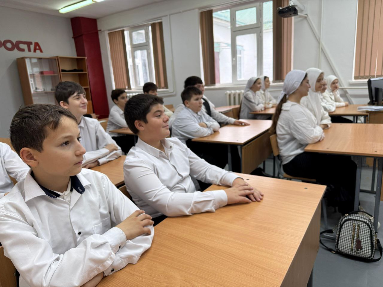 Утро понедельника 1 декабря 2025 года в школе традиционно началось с торжественной линейки, церемонии исполнения гимна Российской Федерации и Чеченской Республики.
