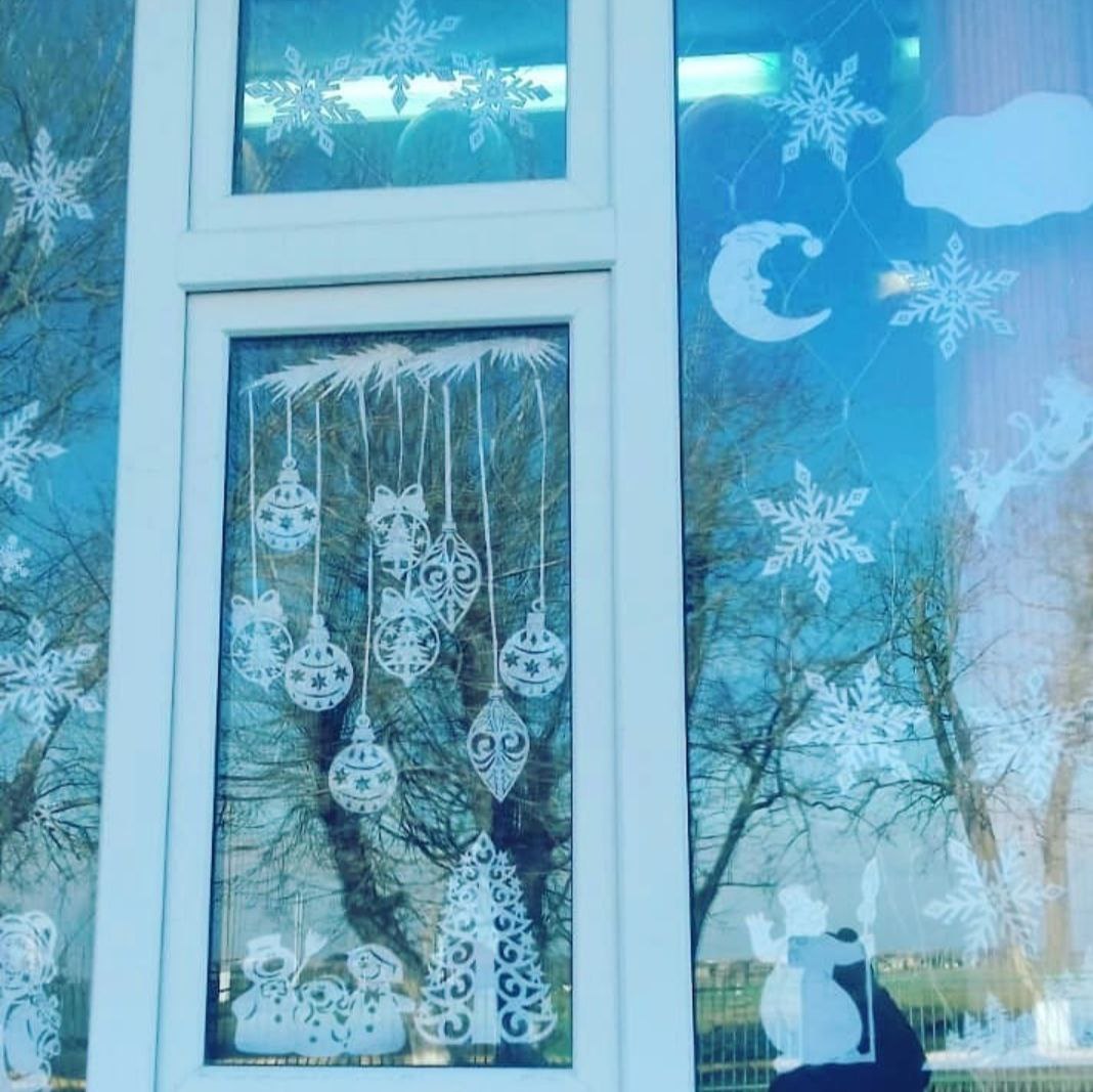 На окнах классов красуются яркие и красочные рисунки на тему зимы, Нового года Здесь можно увидеть заснеженные домики, счастливых снеговиков⛄, нарядные елки🎄 и, конечно, Деда Мороза🎅 с подарками🎁.